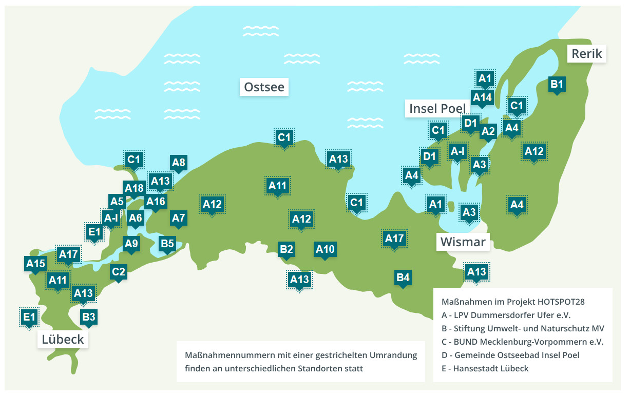 Zur Erreichung dieser Zielstellung setzen wir als Projektpartnerin gemeinsam mit dem Landschaftspflegeverein Dummersdorfer Ufer, dem BUND Mecklenburg-Vorpommern, der Hansestadt Lübeck und der Gemeinde Ostseebad Insel Poel verschiedene Maßnahmen um.