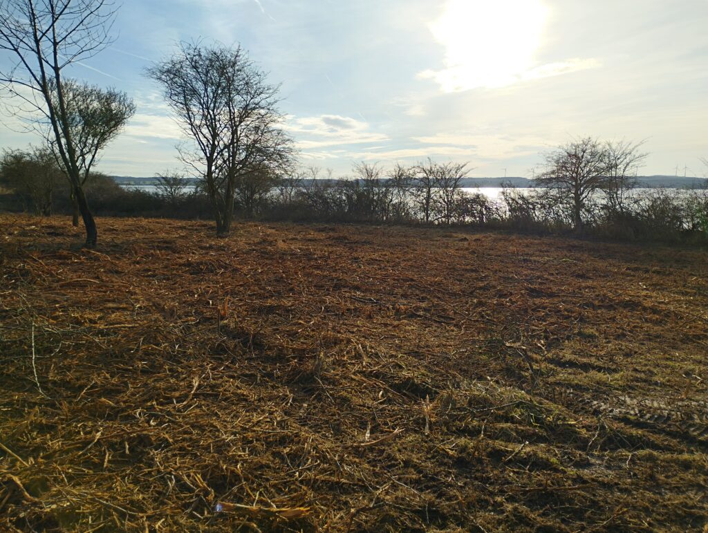Im Rahmen des von Bund und Land geförderten Projektes „HOTSPOT28 – Natürlicher Klimaschutz im Norden“ konnte die Stiftung Umwelt- und Naturschutz nun die benötigten Mittel aufbringen, um diese Gehölze zurückzudrängen. Zeitgleich wurde eine Schneise für einen mobilen Zaun geschaffen, der eine Beweidung mit Schafen und Ziegen ermöglicht.