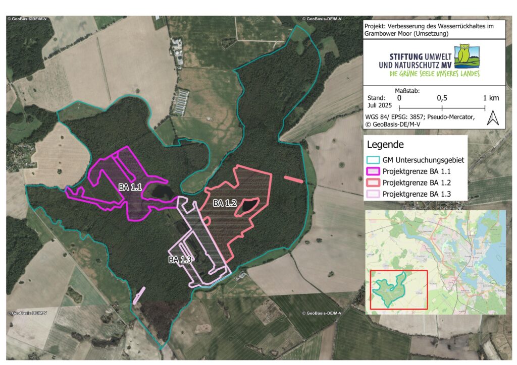 Ziel des Projektes „Verbesserung des Wasserrückhalts im Grambower Moor“ ist die Stabilisierung des Wasserhaushalts sowie die Wiederherstellung eines naturnahen, hochmoortypischen Lebensraums. Die planerisch ausgearbeiteten Maßnahmen werden ab 2026 in zentralen Bauabschnitten umgesetzt. Das Vorhaben leistet einen wichtigen Beitrag zum Klimaschutz, da durch die Wiedervernässung des Torfkörpers die Freisetzung klimaschädlicher Gase deutlich reduziert wird.